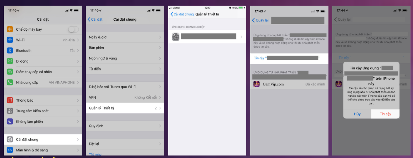 - Bước 4: Tiếp đến bạn phải cho phép điện thoại của mình cài đặt từ nguồn không tin cậy bằng cách vào Cài đặt → Cài đặt chung → Quản lý thiết bị → [Tên đơn vị Phát hành] → Tin cậy